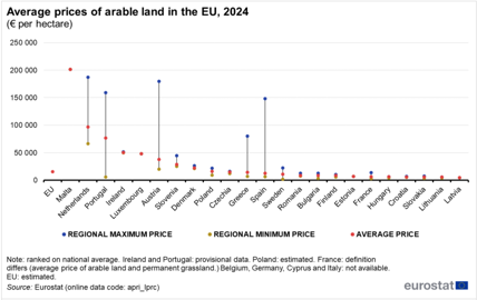 Parmi les 23 pays de l’Union européenne pour lesquels des données sont disponibles pour 2024, le prix d’un hectare de terre arable atteignait 201 263 euros en moyenne à Malte. Le coût particulièrement élevé du foncier agricole sur l’île reflète la disponibilité limitée des terres agricoles et la pression en faveur d’autres usages. Malte est suivi sur le podium par les Pays-Bas (96 608 euros l’hectare en moyenne) et du Portugal (76 656 euros).