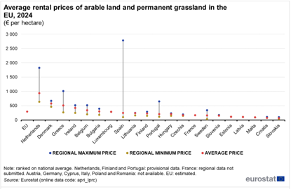 Parmi les régions de l’Union européenne, la location d’un hectare de terres arables et/ou de prairies permanentes en 2024 était la plus chère dans la région espagnole des Canaries (2 785 euros en moyenne), suivie du Flevoland (1 825 euros) et du Brabant-Septentrional (1 098 euros) aux Pays-Bas. À l’inverse, les prix de location étaient les plus bas à Mellersta Norrland et Övre Norrland en Suède (36 euros l’hectare en moyenne en 2024), suivis de Stredné Slovensko (43 euros l’hectare) et Východné Slovensko (44 euros l’hectare) en Slovaquie.