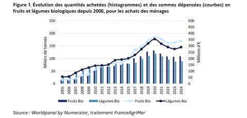 FranceAgriMer observe que ces produits sont « principalement achetés en grande surface », bien qu’ils n’y représentent que 6 % des fruits et légumes achetés en 2024. La proportion de bio dans les achats est plus conséquente dans les foires et les marchés, « mais pour des volumes plus limités ». L’organisme constate par ailleurs que les prix varient en fonction du canal de distribution en fonction des produits bio, « sans que l’on puisse établir une relation entre ces deux variables ».