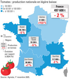 La production de tomates est en baisse de 2 %, avec une augmentation des prix de 10 % au mois d’août comparé à 2024.