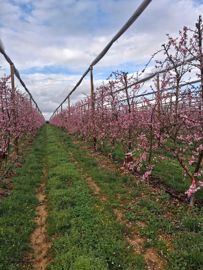 Deux hectares de pêchers ont été plantés en bi-axe en 2022, puis un hectare en axe en 2023, avec un double objectif : réduire les temps d’éclaircissage en mécanisant cette opération et permettre l’installation de filets paragrêles grâce au palissage afin de mieux se protéger des aléas climatiques.