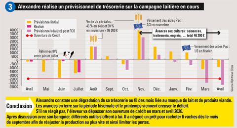 Ce suivi GTE doit s’accompagner d’une projection de trésorerie à six mois, afin d’anticiper les dépassements de découvert. « Aux pertes de production en lait et coproduits s’ajoutent les avances aux cultures sur la période hivernale et le printemps qui creusent la trésorerie », note Étienne Fraslin, s’appuyant sur l’outil Opti’Tréso.