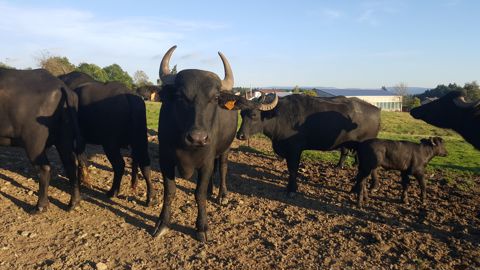 L’hiver, les 28 mères bufflonnes sont nourries au foin, avec un kilo de céréales par jour et complétés par du sel et des minéraux. « 99 % de ce que mangent mes animaux est produit sur l’exploitation », résume Thierry.