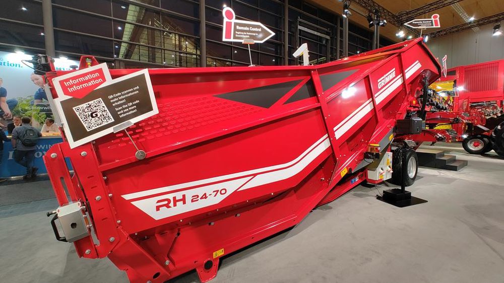 Grimme fait évoluer ses trémies de réception de la gamme RH, avec l’arrivée des RH Gen III, c’est-à-dire de troisième génération. Ces machines adoptent différentes évolutions. Pour commencer, le tapis hérite de poches plus profondes, offrant un déchargement plus homogène et un entraînement du flux facilité. Le fond peut désormais évoluer à des vitesses comprises entre 0,2 et 6 m/min. Son angle d’inclinaison a été réduit et la zone de déchargement élargie de 10 cm. La trémie reçoit différentes protections lors du déchargement, avec une bande de caoutchouc placée en bas.