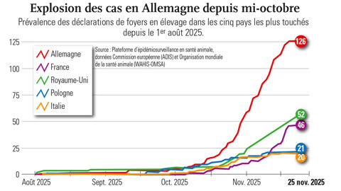 Entre le 17 et le 23 novembre, l’incidence augmente dans la zone à risque de diffusion. En une semaine, 22 foyers en élevage sont confirmés, « soit presque la moitié des foyers détectés depuis le début de la saison », souligne l’ESA. Les foyers se situent principalement dans des élevages de l’ouest du pays, dans les départements de Vendée (12 nouveaux cas), Loire-Atlantique (3), Deux-Sèvres (2) et Maine-et-Loire (1). En parallèle, des foyers isolés sont détectés dans l’Ain, en Côte d’Or ainsi que deux foyers en Dordogne.