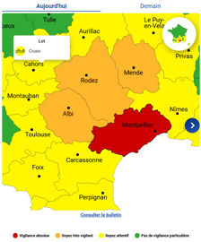 Par ailleurs, les départements du Tarn, de l’Aveyron et de la Lozère ont eux aussi été placés en vigilance orange pour crues, d’après le dernier bulletin publié à 10 heures.