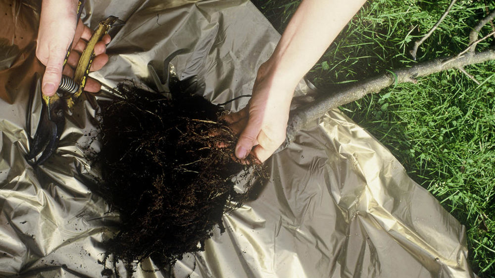 - Un mois plus tard, préparez le pommier juste avant la plantation. Otez les racines cassées ou blessées et raccourcissez les autres de quelques centimètres. Trempez-les ensuite dans un mélange de terre de jardin, de compost et d’eau qui a la consistance d’une boue épaisse (pralin) afin de stimuler leur croissance après la plantation. Taillez également les branches charpentières (celles de plus fort diamètre) à 25 cm de longueur environ (juste au-dessus d’un bourgeon situé vers l’extérieur).