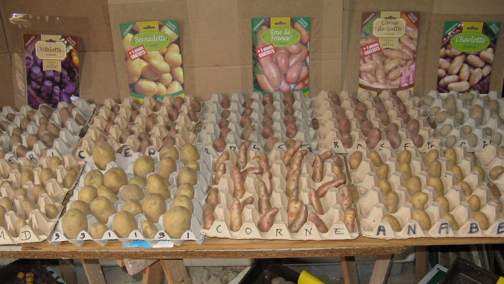 Disposez les tubercules dans une clayette sans les superposer ou mieux dans des boîtes à œufs. Éliminez les plants en mauvais état. Placez-les dans un endroit lumineux et plutôt frais au départ environ 5 à 6°C, puis à 12°C environ au bout de 15 jours. Choisissez une pièce avec un peu d’humidité, une ambiance sèche risquerait de trop déshydrater le tubercule.