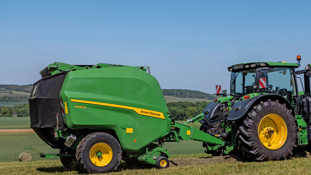 Les presses à chambre variable V452R et V462R intègrent une flèche automatique. En effet, cette dernière est dotée d’une barre d’attelage mobile qui sert à positionner automatiquement la presse sur l’andain. Par exemple, lorsqu’il suit un andain droit, le système guide la presse de gauche à droite en fonction du remplissage de la chambre. L’attelage assure aussi le suivi dans les andains sinueux et les virages. Le rayon de braquage s’en retrouve également réduit, les manœuvres sont ainsi facilitées. La matière est comprimée jusqu’à une pression de 140 kg/m³ grâce au système à double courroie.
