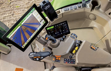 Cet accoudoir reçoit également son propre écran, en plus du terminal principal. Tactile et couleur, cet écran de « commodité » est surtout dédié aux réglages des accessoires et de l’habitacle, comme le siège et la radio. Munis d’une transmission à variation continue, ces tracteurs héritent donc du joystick multifonction de la marque. Cependant, pour ces modèles John Deere a scindé l’offre en deux versions avec le Command X Plus dédié aux opérations de base et le Command X Pro, plus fourni et haut de gamme.