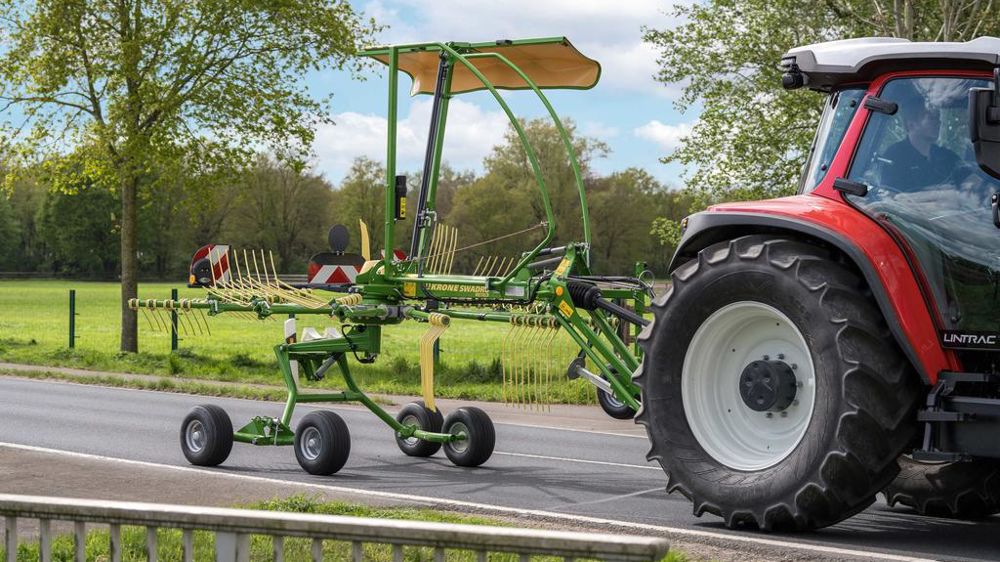 De série, l’andaineur est équipé d’une chaîne cinématique qui ne nécessite aucune maintenance, avec une roue libre et un limiteur à cames. Le Swadro S 460 DB propose une largeur de travail de 4,60 m et confectionne des andains de 0,80 à 1,80 m de largeur. Le rotor de 3,60 m de diamètre embarque 13 bras porte-dents, dont sept sont repliables pour le transport. Ainsi aucun démontage de bras porte-dents n’est nécessaire pour avoir une largeur inférieure à 3 m sur la route.