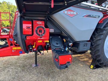 Ce pulvérisateur traîné reçoit une béquille hydraulique de série. Kuhn a également réfléchi à la maintenance lors du développement de sa machine. Ce pulvérisateur est équipé d’un treuil intégré, pour déposer au sol la pompe de pulvérisation afin de réaliser son entretien. Kuhn annonce un temps de 15 minutes pour déposer la pompe. De plus, la cuve principale est équipée d’un puisard et d’un toit démontable pour éviter toute intervention dans la cuve.