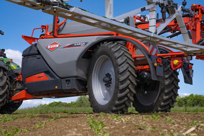 Le Karan repose sur un essieu directeur pouvant braquer jusqu’à 28°. Il peut s’équiper d’une offre de pneumatiques VF allant jusqu’à 2,05 m de diamètre. Ce pulvérisateur est prédisposé pour un système de télégonflage. Côté suspension, Kuhn propose une solution mécanique de base, ou une suspension hydropneumatique en option. Le constructeur annonce un poids maîtrisé avec pour exemple, le Karan 6 000 muni d’une rampe de 36 mètres, affichant 5 690 kg à vide.