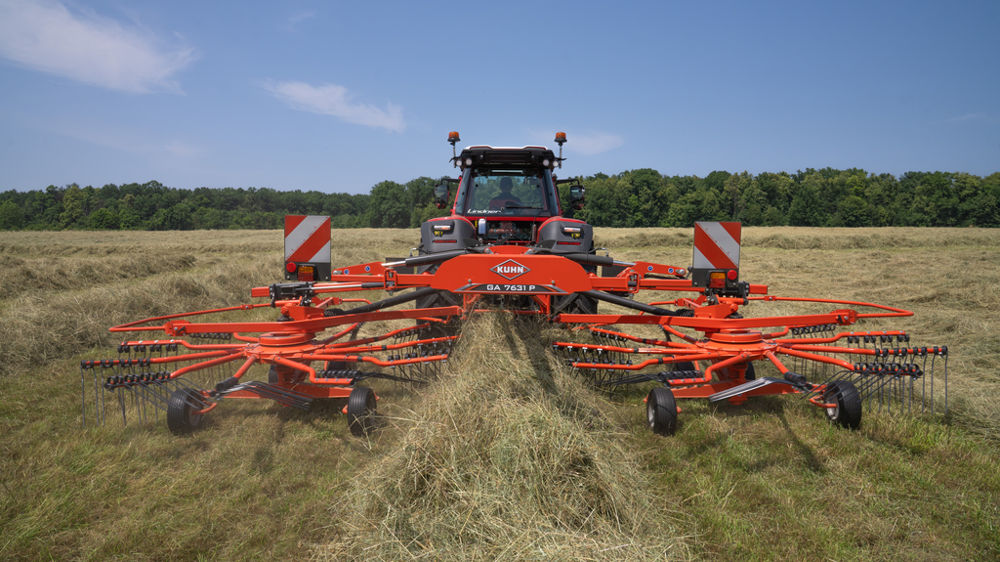 Lorsque l’andaineur monorotor atteint ses limites, Kuhn propose de basculer sur un andaineur porté à deux rotors à dépose centrale. Le GA 7631 P atteint une largeur de ratissage de 7,40 m et intègre le réglage hydraulique de la largeur de travail. Cette machine compacte est capable de confectionner des andains de 1,30 à 2,20 m de largeur.