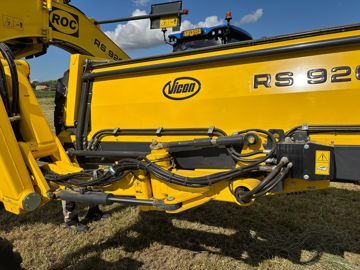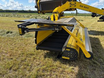 L’andaineur à tapis Roc RS920 est doté de deux unités de ramassage de 3,65 m de large portant la largeur de travail variable de 7,3 à 9,1 m. Chacun des tapis est monté sur un bras oscillant hydraulique suspendu grâce à une boule d’azote. Ce bras offre la possibilité à l’opérateur de régler l’écartement entre les pick-up, y compris pendant leur utilisation.