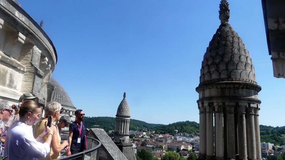 On reprend son souffle. La vue est magique : le centre historique est à nos pieds. Sous nos yeux se dévoilent les différents quartiers : le Puy Saint-Front, le quartier médiéval et renaissance, la rivière Isle. L’édifice a un plan en croix grecque qui l’apparente à Saint-Marc de Venise mais c’est l’église des Saints Apôtres à Constantinople qui lui a servi de modèle.