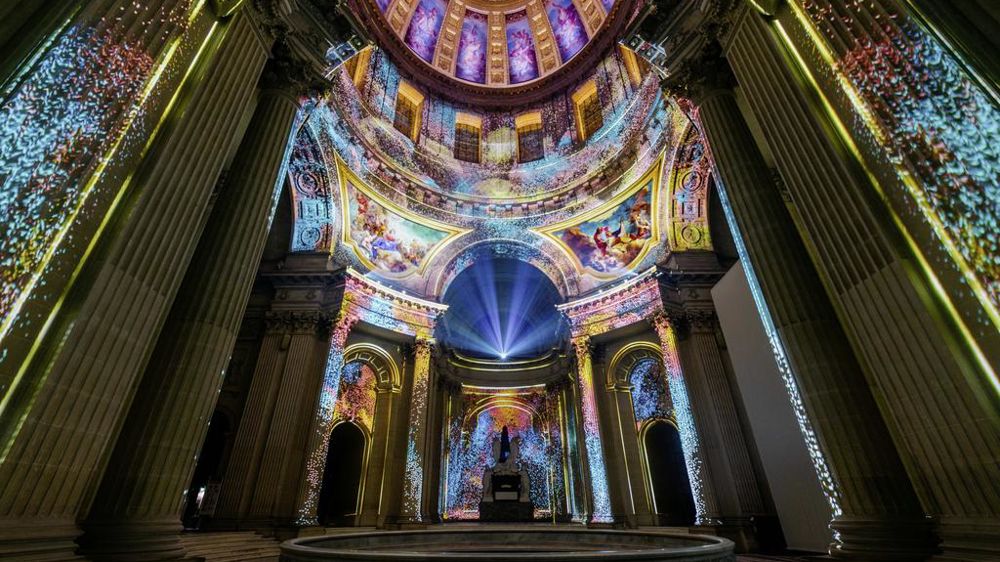 À Paris, l’intérieur du dôme doré des Invalides se pare à son tour de projections lumineuses... Les visiteurs pénètrent à la nuit tombée dans cette église édifiée en 1676 par Jules Hardouin-Mansart pour Louis XIV. Ils se postent en cercle autour du tombeau de Napoléon, debout ou assis sur les marches afin de gagner en recul.