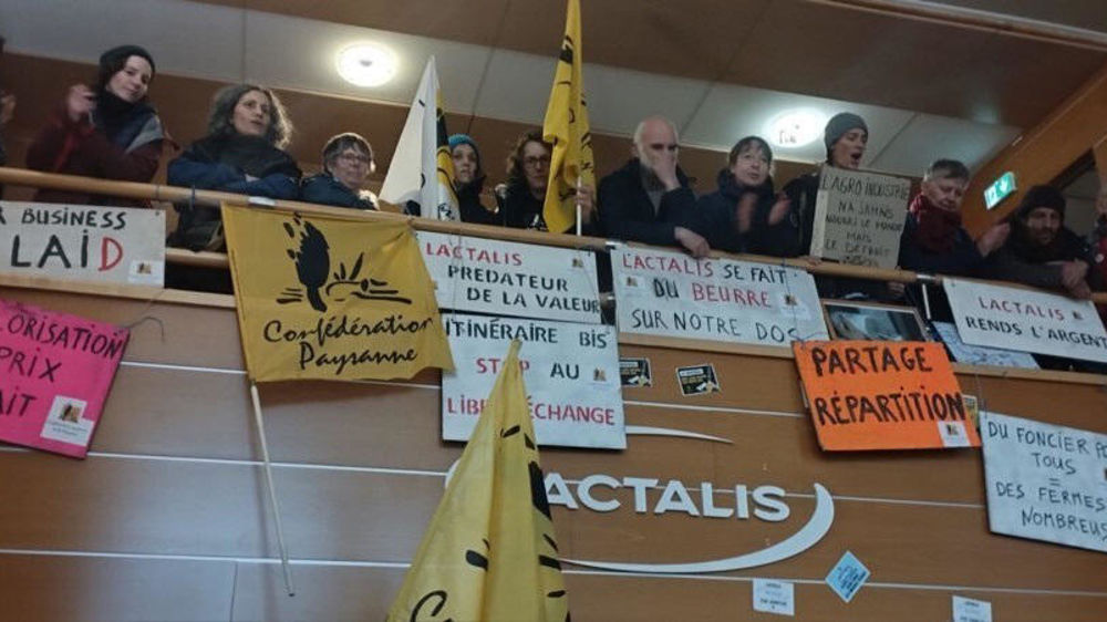 #revenupaysan : plus d'une centaine de paysans et paysannes vient d'envahir le siège social de @groupe_lactalis à #Laval. N°1 des prédateurs de la valeur des éleveurs et éleveuses de lait. ✊✊ pic.twitter.com/h489Fb4e7H
