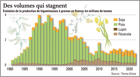 Pour l’heure, du côté des graines, la dynamique ne se reflète pas encore dans les surfaces engagées et la production. En 2022, 433 000 hectares de pois, soja, féverole, lupin avaient été implantés en France pour une production totale de 0,9 million de tonnes ; un chiffre en baisse de 21 % par rapport à 2021 (voir le graphique ci-après). Les données de 2023 semblent être de meilleur augure, mais ne sont pas encore stabilisées.