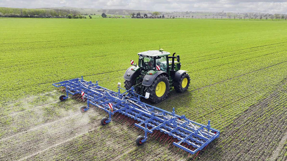 Après les versions de 6 et 9 mètres, Lemken décline désormais sa herse étrille dans une version de 12,20 mètres de largeur de travail. Les dents sont disposées sur huit rangées, réparties sur quatre poutres. La grande particularité de la Thulit 12 est la répartition asymétrique des dents avec un écartement de 31,25 mm, qui limite les risques de bourrage au centre de la machine.