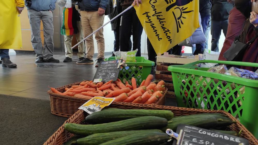 La Confédération paysanne a récupéré, le jeudi 25 avril 2024, des fruits et légumes des magasins environnants pour les amener dans le hall de l’institution pour réclamer des « prix minimums d’entrée » des fruits et légumes étrangers en France.