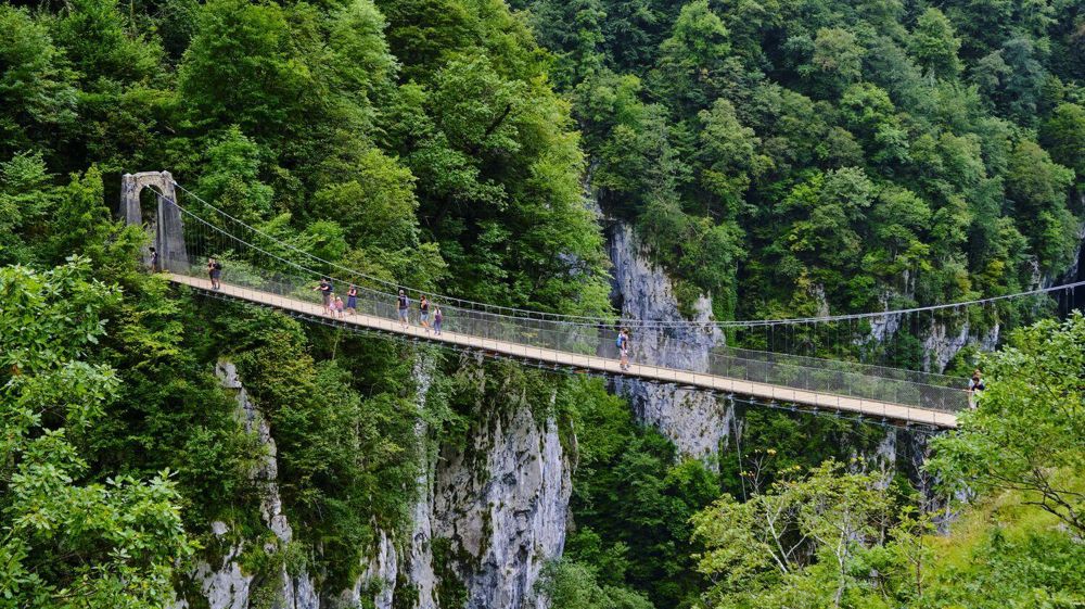 Après une marche d’approche d’environ 1 heure, le sentier approche des gorges, laissant entrevoir la passerelle flottant au-dessus du paysage. S’y aventurer, c’est dominer 150 mètres de vide envahis d’une végétation luxuriante. Sans difficulté technique, cet itinéraire peut s’effectuer en aller-retour depuis l’auberge de Logibar, à Larrau. Le sentier est accessible aux familles avec enfants, à condition d’adapter le rythme pendant la montée, qui peut s’avérer un peu éprouvante pour les marcheurs débutants.