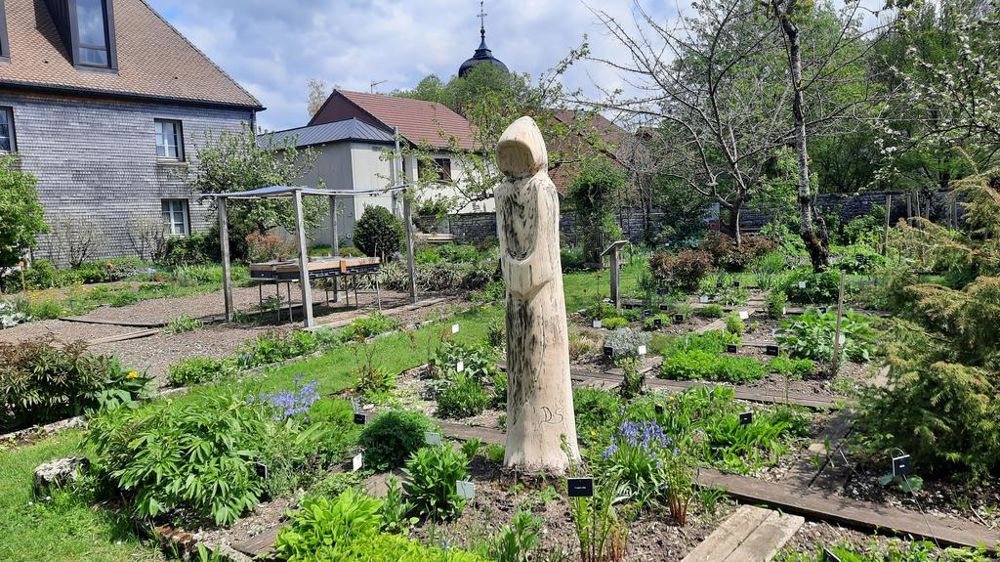 Alors que la France comptait plus de 30 000 jardins de curé au XIXe siècle, la plupart ont disparu. Entretenu par des bénévoles, celui de la Rivière-Drugeon se visite librement ou en compagnie des membres de l’association culturelle du village (1). Adossé au presbytère, clos de murs protecteurs, le jardin de la petite commune du Haut-Doubs s’organise selon un plan en croix. Symétrique, il est aménagé en carrés peuplés de plantes (médicinales et aromatiques), de fleurs, de légumes et ceinturés de buis. Symbole d’immortalité, ce dernier est utilisé pour les rites religieux. Des arbres fruitiers bordent les allées. Quelques pieds de vigne, indispensables à l’élaboration du vin de messe, sont plantés le long des murs. Et l’endroit comporte un oratoire pour le recueillement.