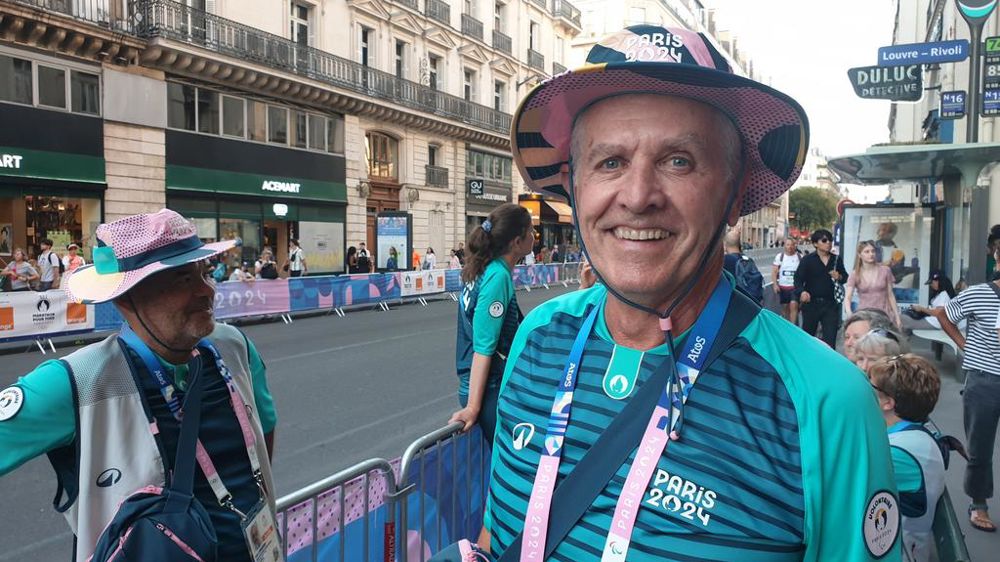 Tout le monde veut son chapeau ! Habillé d’un T-shirt bleu vert et d’un bob rose bariolé, Patrice Vellard est positionné le 31 juillet 2024 sur le pont Alexandre III, en plein cœur de Paris. Il ouvre et ferme la corde au point de passage des courses olympiques (épreuves cyclistes, triathlon et marathon pour tous) et renseigne les spectateurs.
