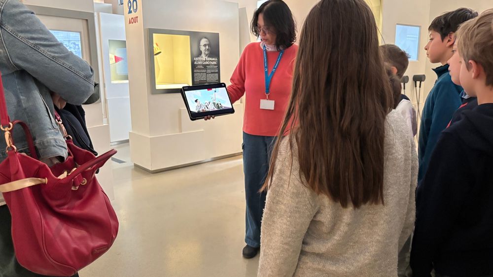 Accompagnés d’une conférencière, ils déambulent dans les collections permanentes durant 1h30. Les extraits du dessin animé diffusés sur une tablette leur permettent de s’immerger dans le thème de la salle : l’exode, l’occupation, la résistance… L’occasion de générer de nombreux échanges entre les parents, les enfants et la guide.