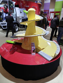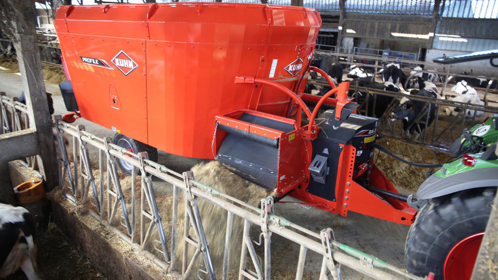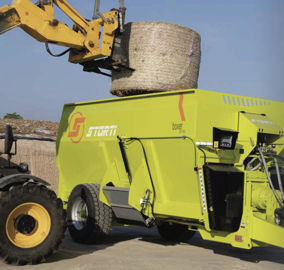 La ration est ainsi transportée vers l’arrière de la cuve par les spirales de la paroi interne et ramenée avec l’avant par la vis. C’est ce mouvement qui réalise le mélange. La Rotomix remporte un certain succès dans les grands troupeaux dont la ration contient une grande proportion d’ensilage.