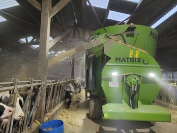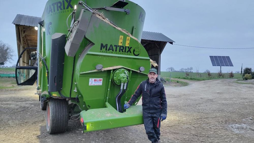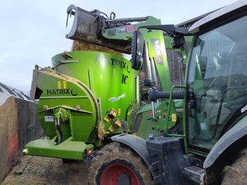 Olivier indique que ce choix était logique. « Le prix des machines a beaucoup augmenté depuis ces dernières années. Accumuler un bol mélangeur, une pailleuse et un tracteur revient plus cher que la Matrix. » Olivier poursuit en montrant le tracteur de cour, le seul sur l’exploitation, ce qui signifie qu’il aurait fallu investir dans un second tracteur pour une machine traînée.