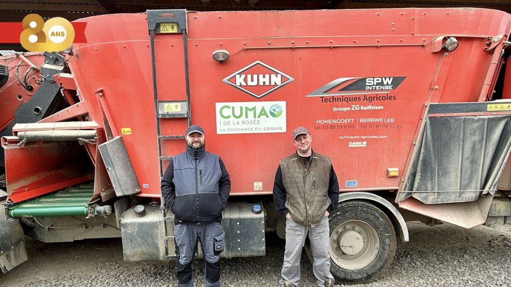 « Si je devais m’occuper de l’affouragement de mes 110 vaches laitières, il me faudrait un salarié supplémentaire », assure Damien Fritsch. Éleveur à Mittelhausen, dans le Bas-Rhin, il a choisi de déléguer cette astreinte en intégrant la Cuma de la rosée qui dispose d’une mélangeuse automotrice Kuhn de 22 m3. Benoît Reiss, chauffeur attitré de la machine, prépare tous les matins la ration de sept troupeaux laitiers répartis dans un rayon de 10 kilomètres autour du village où est installée la Cuma.
