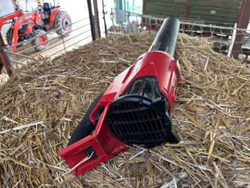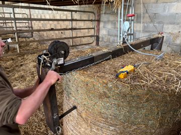 C’est un treuil manuel qui se charge de pincer les deux piques bottes dans la balle. « J’utilise environ une botte tous les deux jours en été et une et en hiver, je monte à une balle et demie pour deux jours. Une fois que la botte est installée sur la plateforme, la pince vient se mettre dans des supports prévus à cet effet. Les balles chargées font entre 400 et 500 kg. La paille que j’utilise a été prédécoupée au pressage. Il est ainsi plus simple pour moi de la répartir avec mon souffleur électrique », précise Sébastien.