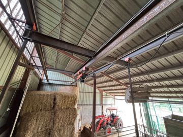 « J’ai mis pas mal de temps, car j’ai dû fabriquer et installer la plateforme avec les bêtes encore présentes dans le bâtiment. Les premières pièces ont été installées en octobre 2024. J’ai tout monté avec l’aide d’un treuil manuel à levier et d’une échelle. Je ne pouvais ni louer d’échafaudage, ni de nacelle, car j’ai monté ma plateforme à temps perdu donc rien n’était fixe. Mis bout à bout, je pense que j’ai passé entre 150 et 200 heures entre l’assemblage de la structure de support et celui de la plateforme en elle-même. »