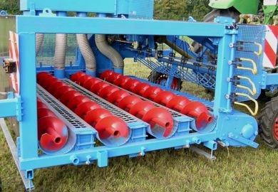 Pour le moment, elles retombent sur le sol, à l’extérieur de l’andain mais l’inventeur prévoit de monter un bac de collecte, ce qui permettrait de supprimer une partie des graines d’adventices. Un second chauffeur presse en suivant. Selon August Kuhlenkamp, sa machine présente aussi l’avantage de débarrasser la récolte des éventuels insectes présents dans le foin et d’éviter ainsi sa contamination.