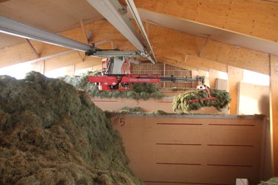 Le bâtiment est orienté Est/Ouest et mesure 14 m x 36 m, avec 6 m d’écartement entre les poteaux. La travée située la plus à l’Ouest sert de quai de déchargement. C’est également de ce côté que l’air entre dans le caisson confectionné en bois OSB entre la charpente et la toiture. Viennent ensuite les trois cases de séchage. Elles occupent 8 x 14 m chacune, soit une surface utile intérieure de 104 m², en déduisant l’épaisseur des cloisons. Remplies à 6,5 m de hauteur, elles peuvent chacune contenir 68 t de MS. Le ventilateur et le local technique ont été placés à l’extrémité Est du séchoir. Seul inconvénient de ce système avec déchargement à une extrémité : la fourche a plus de distance à parcourir quand il faut remplir la deuxième ou la troisième case.