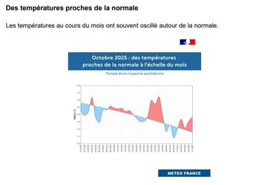 « Les températures au cours du mois d’octobre ont souvent oscillé autour des normales, comme cela a été le cas en septembre », rapporte Météo-France dans le bilan climatique d’octobre 2025, publié le lundi 3 novembre 2025.