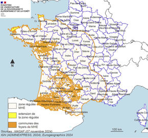 Depuis la reprise de l’activité vectorielle, c’est-à-dire des culicoïdes, au 1er juin 2024, les autorités sanitaires ont repéré le virus dans 30 départements : Haute-Garonne, Gers, Pyrénées-Atlantiques, Hautes-Pyrénées, Landes, Maine-et-Loire, Pyrénées-Orientales, Ariège, Dordogne, Tarn, Tarn-et-Garonne, Aude, Aveyron, Loire-Atlantique, Lot, Lot-et-Garonne, Hérault, Vendée, Vienne, Indre-et-Loire, Sarthe, Cantal, Charente, Charente-Maritime, Creuse, Cher, Lozère, Morbihan, Ille-et-Vilaine, et Mayenne.