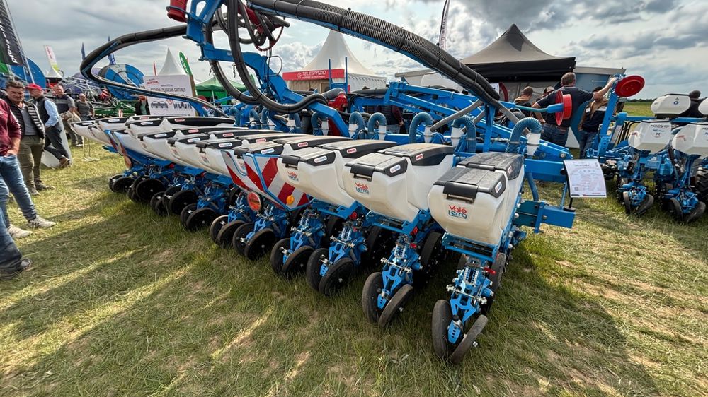 Le constructeur propose des machines capables de passer de 12 rangs à 45 cm à 8 rangs à 75 cm, de 12 rangs à 50 cm à 8 rangs à 75 cm, de 12 rangs à 45 cm à 8 rangs à 80 cm, de 12 rangs à 50 cm à 8 rangs à 80 cm, et enfin de 11 rangs à 60 cm à 8 rangs à 80 cm. Le modèle exposé sur Innov-Agri était muni d’une tête de répartition pour l’incorporation d’un produit solide (engrais starter). Le passage de ce dispositif de 12 à 8 rangs se fait manuellement en changeant la tête de répartition.