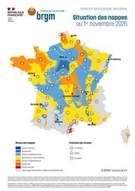 Le bureau de recherches géologiques et minières (BRGM) a publié lundi 10 novembre 2025 son bulletin hydrogéologique du 1er novembre. Ce document met en avant l’état des grandes nappes phréatiques régionales, et non l’intégralité des nappes. Elles sont au nombre de 6 000 à avoir été identifiées sur le territoire national.