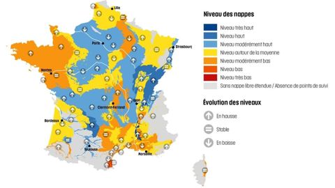 Localement, le BRGM observe que l’état des nappes de la plaine du Roussillon et du massif des Corbières « s’améliore lentement » mais qu’elles affichent toujours des niveaux bas. Ces nappes de l’Aude et des Pyrénées-Orientales, deux départements à l’activité viticole, arboricole et touristique marquée, souffrent de sécheresse depuis plusieurs années. Parmi les nappes réactives, celles qui réagissent rapidement aux précipitations, les niveaux sont aussi moins favorables dans le Massif armoricain en Bretagne, ainsi que dans le pourtour méditerranéen plus généralement et en Corse.
