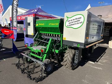 Le spécialiste du semoir à herbe SimTech présente un attelage original constitué d’un semoir VT-Sem couplé à un porte-outils autonome Robotti.