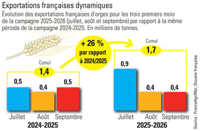 Cette année, la récolte des orges aussi s’est terminée à l’avance sur le calendrier habituel. La production 2025 est estimée à 11,9 Mt, en hausse de 21,4 % sur un an et supérieure de 7,3 % à la moyenne 2020-2024. Tandis que les surfaces sont en légère diminution sur un an (à 1 788 000 ha), le rendement progresse fortement, à 66,4 q/ha, soit plus de 12 q/ha de plus qu’en 2024.