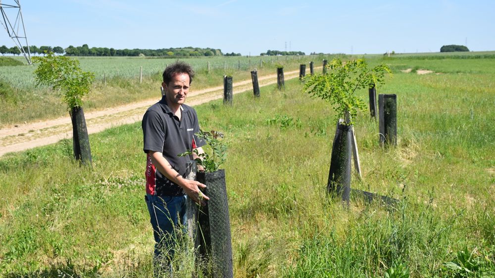 À 40 ans, Étienne est bien conscient des impacts du changement climatique et anticipe son évolution. Il vient de planter 400 arbres, « pour faire de l’ombre » à ses brebis. « 60 à 70 % des luttes échouent quand il fait trop chaud, et les périodes chaudes s’allongent. J’ai donc replanté des arbres là où Napoléon en avait planté en 1820 », explique l’éleveur, féru d’histoire. En discutant de son projet avec Benoît Caumont, conseiller en agroforesterie, il choisit des variétés qui pourront être taillées en têtard, fournissant ainsi de l’ombre mais aussi du fourrage en fin d’été. Il opte pour le frêne à fleurs, l’acacia, le chêne vert et le mûrier blanc.