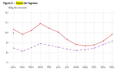 En janvier 2026, le cours de l’agneau a baissé de 3,6 % sur un an. En plafonnant à 9,96 €/kg de carcasse, il reste supérieur de 17,7 % à son niveau moyen des cinq dernières années. Si le cours de l’agneau est au ralenti, les données de décembre 2025 révèlent que les exportations d’agneaux vivants ont progressé de 18,8 % sur un an et de 19,3 % par rapport à la moyenne quinquennale.