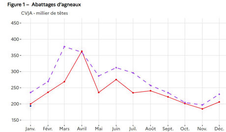 Du côté des abattages d’agneaux, ils reculent de 3 % sur un an et de 17,6 % par rapport à la moyenne quinquennale. À l’inverse, les abattages d’ovins de réforme augmentent de 8,6 % en un an, même s’ils restent inférieurs de 13,5 % à leur niveau moyen des cinq dernières années.
