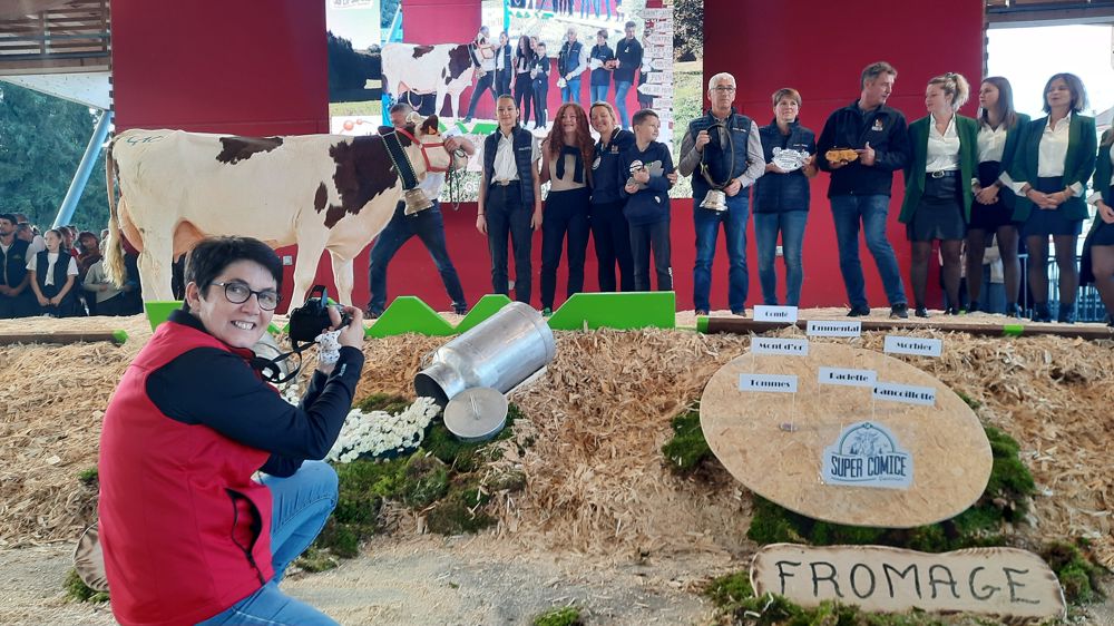 Appareil photo reflex en bandoulière, caméra vidéo en haut de sa perche, Anne Boucard ne perd pas une miette du supercomice qui se déroule ce 22 octobre 2022 à Pontarlier (Doubs). Souriante et concentrée, elle se donne à fond. « Il y a des moments à ne pas louper, explique-t-elle. Quand toute une famille de sélectionneurs pleure d’émotion lors de la remise des prix par exemple ». Pour partager ses clichés, elle a créé en 2008 une page Facebook : Passion’photo.