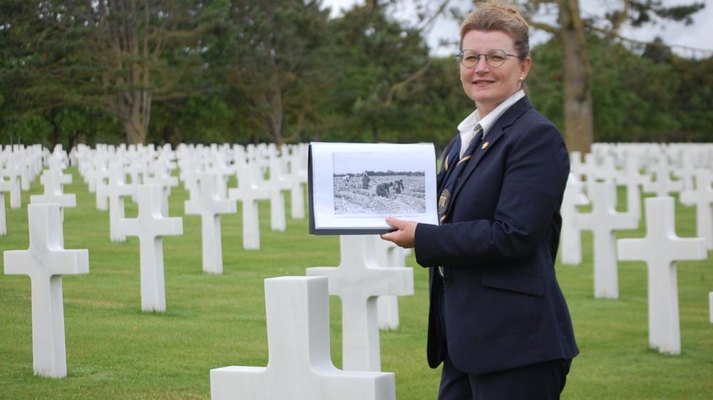 Dans les allées du cimetière américain de Colleville-sur-Mer où elle est guide, Stéphanie Le Bris, 49 ans, est à l’écoute. Portant l’uniforme de rigueur pour sa fonction, elle renseigne posée et souriante les visiteurs. À certains, la mère de trois enfants confie parfois l’histoire de ses propres grands-parents agriculteurs ayant exploité une partie des terres du cimetière.