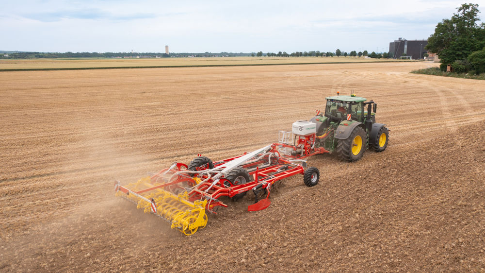Le déchaumeur traîné Terria du constructeur Pöttinger gagne en polyvalence et en technicité grâce à l’arrivée d’un lot de nouvelles options au catalogue. Il peut en effet être utilisé pour l’implantation de cultures au moment du déchaumage, avec l’installation de la trémie Tegosem. Cette dernière, d’une capacité de 500 litres, dispose d’un doseur électrique et d’une turbine hydraulique pour la propulsion des graines dans les descentes. Les points de chute sont alignés juste devant le rouleau de rappui afin de favoriser le contact avec la terre. Le chauffeur pilote son semis à l’aide du terminal en cabine. Il y trouve aussi des informations, comme le niveau de la trémie renseigné par un capteur.