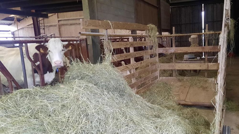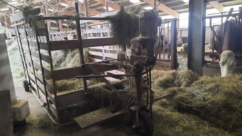 Jean-François Brocard a autoconstruit son distributeur de foin à l’économie. Il a utilisé une ancienne roue de râteau faneur et un moteur électrique équipé d’un réducteur de puissance (3 CV) pour monter sa cage à foin, dont la capacité avoisine une tonne. Elle est remplie au bout du couloir d’alimentation par la griffe du séchage en grange. Poussée à l’autre extrémité du couloir, 40 mètres plus loin, elle se vide toute seule.
